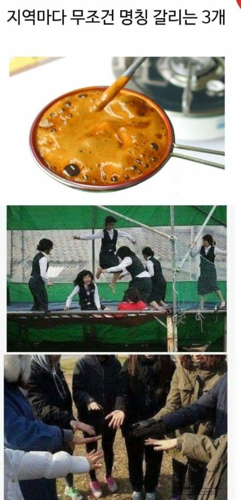 지역마다 무조건 이름 갈리는 3가지.jpg 1. 달고나 or 뽑기 2. 방방 3. 쫄려도 한판 데덴찌 submitted by 무우무우2022.02.28, 15:04